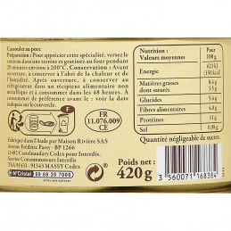 Lingotbönor 29 %, vatten, bitar av benfria, rökta fläsklägg 23,5 % (benfria fläsklägg [équivalent viande crue mise en œuvre : 20%] , vatten, salt, naturlig peppararom), grillad Toulouse-korv 11,9 % (fläskkött, fläskfett, salt, peppar, naturligt pepparskinn), bitar av revbensspjäll med ben tillagade i ankfett 7,1 % (fläskrevben, ankfett), fläsksvål, ankfett, purjolök, vitlöksmassa (vitlök, salt), fläskfett, morötter, lök, köttjuice, naturliga peppararomer, tomat, persilja, timjan, lagerblad, salt, muskotnöt, koriander, salvia, ingefära, kanel, kryddnejlika, oregano, naturlig arom. Fläsk: ursprung Frankrike. 99 % av dessa ingredienser är av franskt ursprung.
