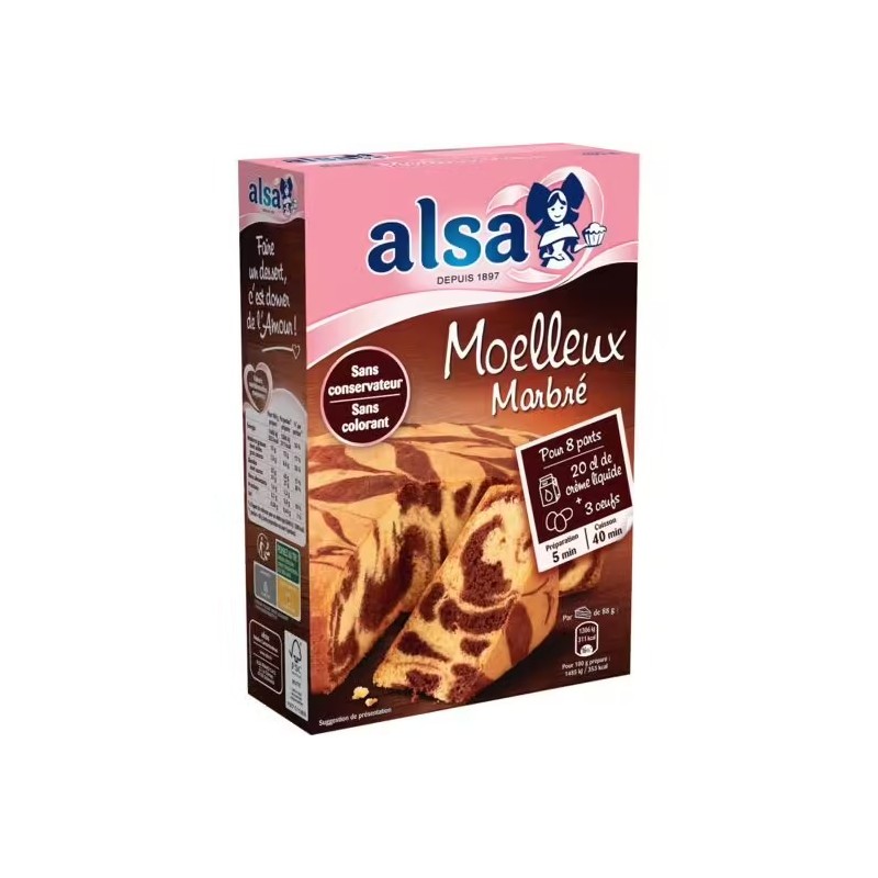 Alsa – Moelleux Marbré 435g – Snabb och enkel kakmix En generös marmorerad kaka med en unik mjukhet. Tillsätt bara 20 cl grädde och 3 ägg i smeten och sätt in den i ugnen innan du glatt alla dina sötsugare. • En luftig konsistens för en otroligt mjuk kaka; • En god, delikat chokladsmak; • En enkel, snabb och idiotsäker kaka; • För 8 personer; • Inga färgämnen eller konserveringsmedel.
