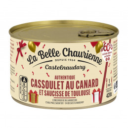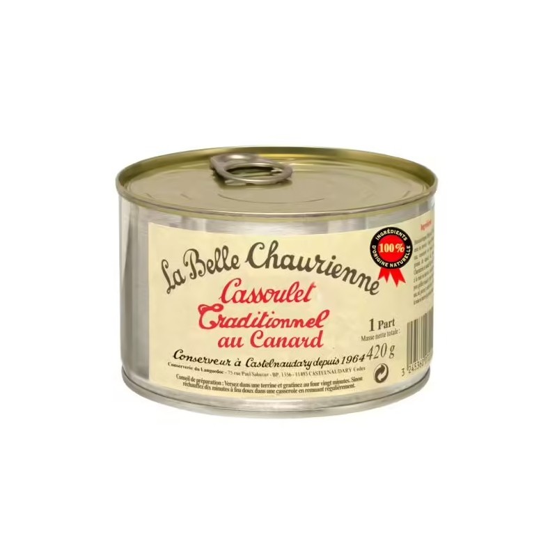 Lingotbönor 35 % - Vatten - Förkokt ankhylsa 20 % (ankhylsa från Frankrike, salt) - Grillad Toulouse-korv 11 % (fläskkött och fett från EU, vatten, naturligt fläskfläsk, salt, peppar) - Tomatpuré - Salt - Ankfett - Vitlök - Peppar. (% uttryckt vid bearbetning) - Lingotbönorna kommer inte från Castelnaudary