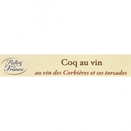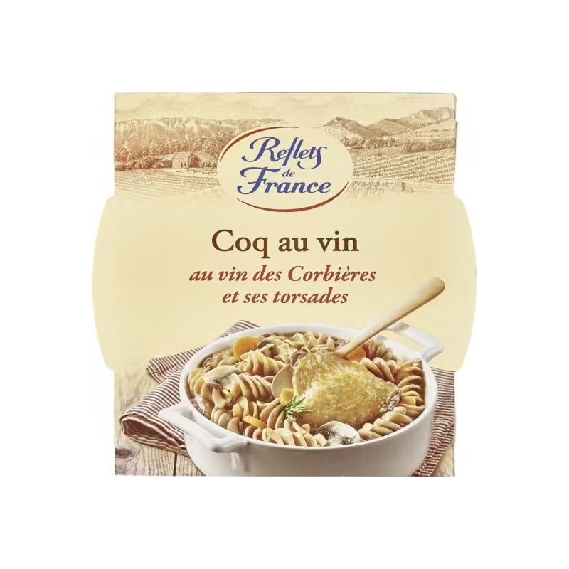 Förkokt kycklinglår* 26,6 %, förkokta spannmålsspecialiteter 23,3 % (vatten, premium durumvetemjöl*, äggvitepulver), AOP Corbières rött vin* 18,7 % (innehåller SULFITTER), vatten*, lök*, morötter* 3,7 %, champinjoner* 2,7 %, salt*, modifierad kassavastärkelse, rödvinsvinäger (innehåller SULFITTER), solrosolja, vitlök*, peppar, lagerblad, timjan. *Ingredienser av franskt ursprung.