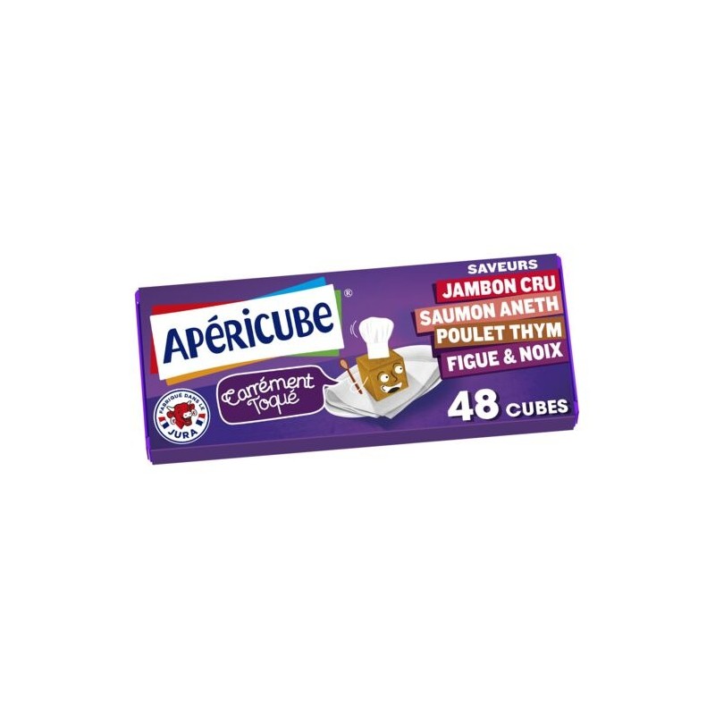 Unna dig Apéricube Carrément Toqué och dess krämiga och varierade 3-stjärniga ostbitar, i smaker som rå skinka, laxdill, kycklingtimjan och fikonvalnöt, för en färgglad aperitif. Tillverkad i Frankrike i våra fabriker i Jura, utan tillsatta konserveringsmedel, färgämnen eller artificiella smakämnen.