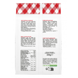 socker, mjukt VETEMJÖL, rapsolja, ÄGG, choklad 14 % (socker, kakaomassa, kakaosmör, emulgeringsmedel: lecitiner (SOJA)), invertsockersirap, kakaopulver, stärkelse, naturlig vaniljarom (innehåller alkohol), jäsmedel: natriumkarbonater och citrater (VETE), salt