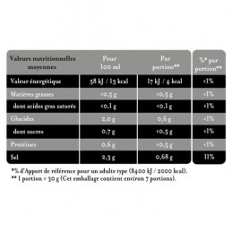 Fettarmes Dressing (43 %). 42 % weniger Fett im Vergleich zu einer klassischen Vinaigrette (75 % Fett) bei 2850 kJ / 680 kcal pro 100 g.