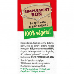 Ingredienser: Salt, potatisstärkelse*, socker*, palmolja*1, hydrolyserat vegetabiliskt protein* (VETE), naturliga aromer av SELLERI, lök, bockhornsklöver och kryddnejlika; vitlök*, koriander*, svartpeppar*, gurkmeja*. Kan innehålla: ÄGG, FISK, MJÖLK, SOJA. *Från ekologiskt jordbruk. 100 % från ansvarsfulla plantager. Mer information på www.maggi.fr/hdp .