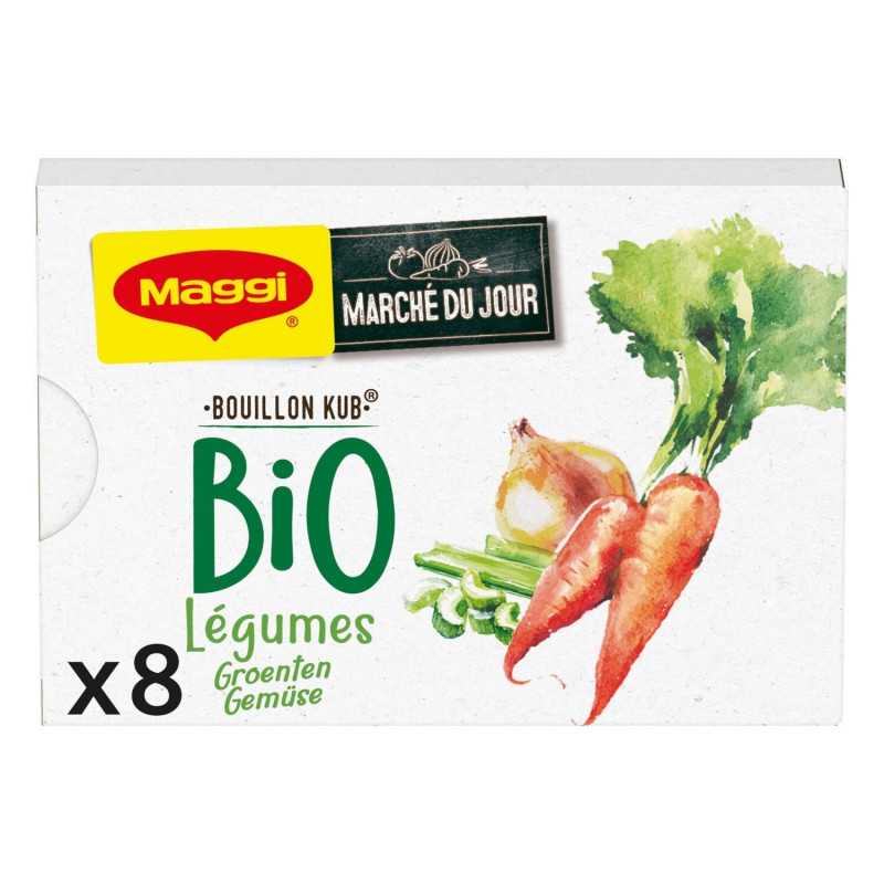 Ingredienser: koksalt, grönsaker* 11 % (lök* 3,5 %, selleri* 3,3 %, morot* 1,6 %, palsternacka*, spenat*), potatisstärkelse*, socker*, glukossirap*, sheasmör*, jästextrakt*, naturliga grönsaks-, lök- och selleriaromer; gurkmeja*, svartpeppar*, vitlök*. Kan innehålla: ÄGG, FISK, GLUTEN (VETE), MJÖLK, SOJA. *Från ekologiskt jordbruk.