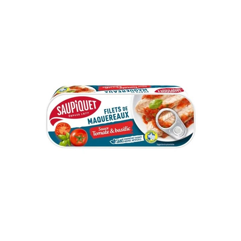 Saupiquet-makrillfiléer med tomat- och basilikasås är möra makrillfiléer som serveras med en tomatsås förstärkt med basilikablad för extra fräschör!