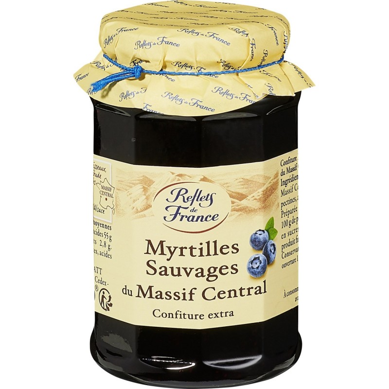 Vilda blåbär från Massif Central, socker, geleringsmedel: pektiner, surhetsreglerande medel: citronsyra. Tillagad med 50 g frukt per 100 g färdig produkt. Totalt sockerinnehåll: 55 g per 10 g färdig produkt.
