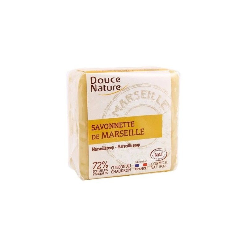Marseille tvål - 100 g. Cosmos Natural-certifierad. Tillverkad i Frankrike, traditionell kittelförtvålning. 72 % vegetabiliska oljor. Hypoallergen. Ej testad på djur. Lätt biologiskt nedbrytbar. Inget animaliskt material, inga petrokemiska derivat, inga färgämnen, inga syntetiska parfymer. 100 g tvål. Ingredienser - INCI: Natriumpalmat, vatten, natriumpalmkärnat, natriumklorid, natriumhydroxid. 100 % av de totala ingredienserna är av naturligt ursprung. Nettovikt: 100 g. Tillverkad i: Frankrike.