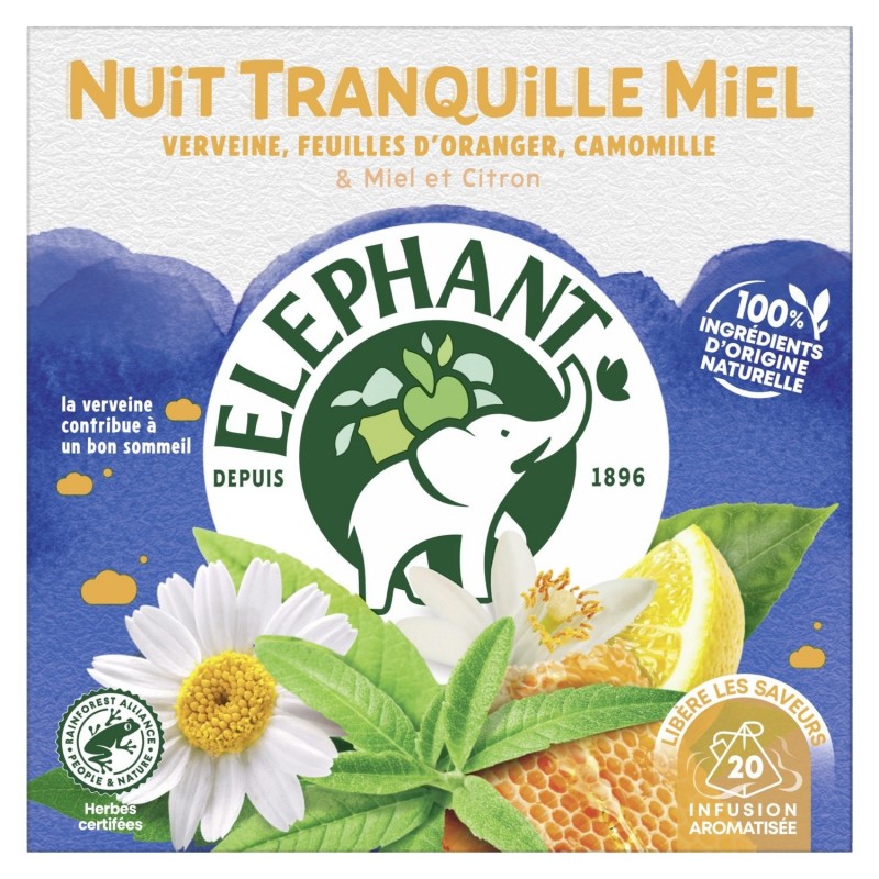 Med Tranquil Night Honey Lemon-infusionen och dess 20 Pyramid®-påsar kan du njuta av söta drömmar och upptäcka den rundade smaken av apelsinblad i kombination med citrontonerna från verbenablad, känt för sina lugnande egenskaper, och kamomill. Allt förstärkt av sötman från honung och citron. Genom att välja Rainforest Alliance-certifierade örter vill Elephant ta hand om planeten och varje dag bidra till en bättre värld för människor och natur. Det är vårt sätt att ingjuta glädje och gott humör. Hemligheten bakom vår infusion? 100 % av ingredienserna är av naturligt ursprung. Bara för dig har Elephant noggrant valt ut växter för att erbjuda dig detta Well-Being-sortiment. För en idealisk smakupplevelse, låt din Pyramid®-infusionspåse dra i 4-5 minuter i 200 ml varmt vatten och njut. Elephant-äventyret började 1896 och fortsätter än idag. Vilket, såvitt elefanter kan minnas, är en riktig upplevelse för en infusionsskapare... Hans största nöje har sedan alltid varit att väcka våra smaklökar! Elephant gör lyssnandet till naturen till en verklig styrka, som han använder för att välja de bästa växterna och skapa läckra, unika infusioner som uppskattas av alla. Men missta dig inte, Elephant*, fransmännens favoritmärke, tillför i sin stora generositet också vänlighet, enkelhet, en touch av humor och en touch av originalitet. Så gå med i stammen och upptäck alla andra läckra recept i vårt Well-Being-sortiment. *Elephant, värde- och volymledare i Frankrike — Nielsen år 2022