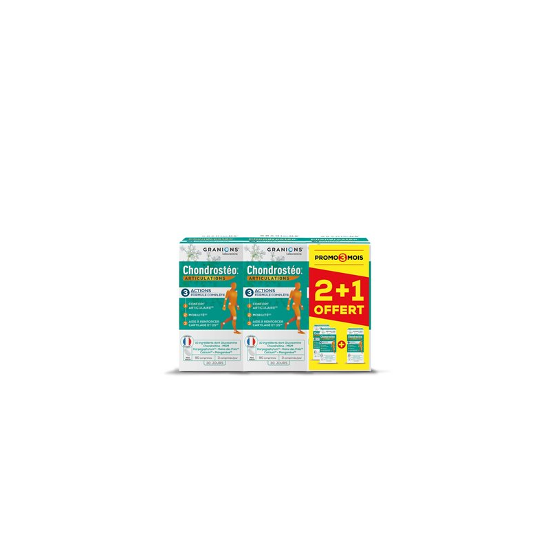 Granions Chondrostéo+ Joints 3 x 90 片裝(含 90 片免費片劑)是一種片劑形式的食品補充劑,具有三重功效配方,作用於關節的核心。